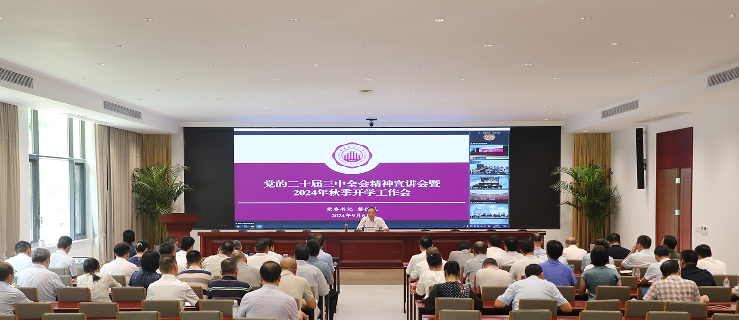 9月6日下午,学校召开党的二十届三中全会精神宣讲会暨2024年秋季学期开学工作会。全体校领导,各学院院长、机关教辅部门主要负责人,安科公司负责人在教学主楼B117会议室主会场参会;各党总支书记,全体教职工在各分会场参会。会议由学校党委书记黎德龙主持。