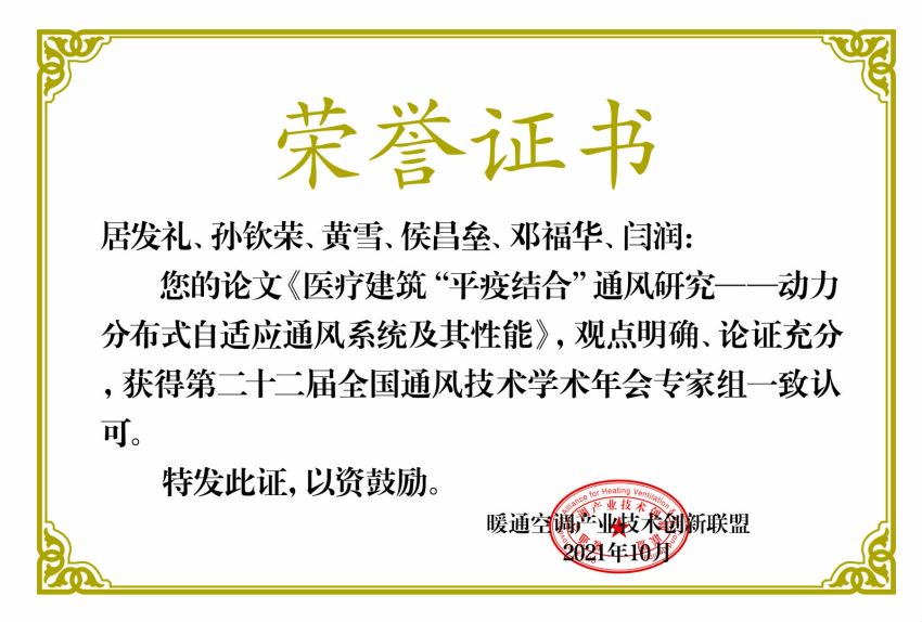 医疗建筑“平疫结合”通风研究团队共发表论文6篇,其中4篇进行了大会报告。该系列论文为中国勘察设计协会《医疗建筑通风设计标准》的研编成果,该标准由我院居发礼、孙钦荣和刘丽莹老师作为标准参编人员。我院居发礼老师所发表的《医疗建筑“平疫结合”通风研究-动力分布式自适应通风系统及其性能》获得年会专家组的一致认可,被选为本届年会优秀论文。本次年会“线下转线上,人气不降、效果不减”,通过参加本次年会,既集中展现了医疗建筑“平疫结合”通风研究团队的科研成果,又体现了满足社会急需的学科特色发展定位。