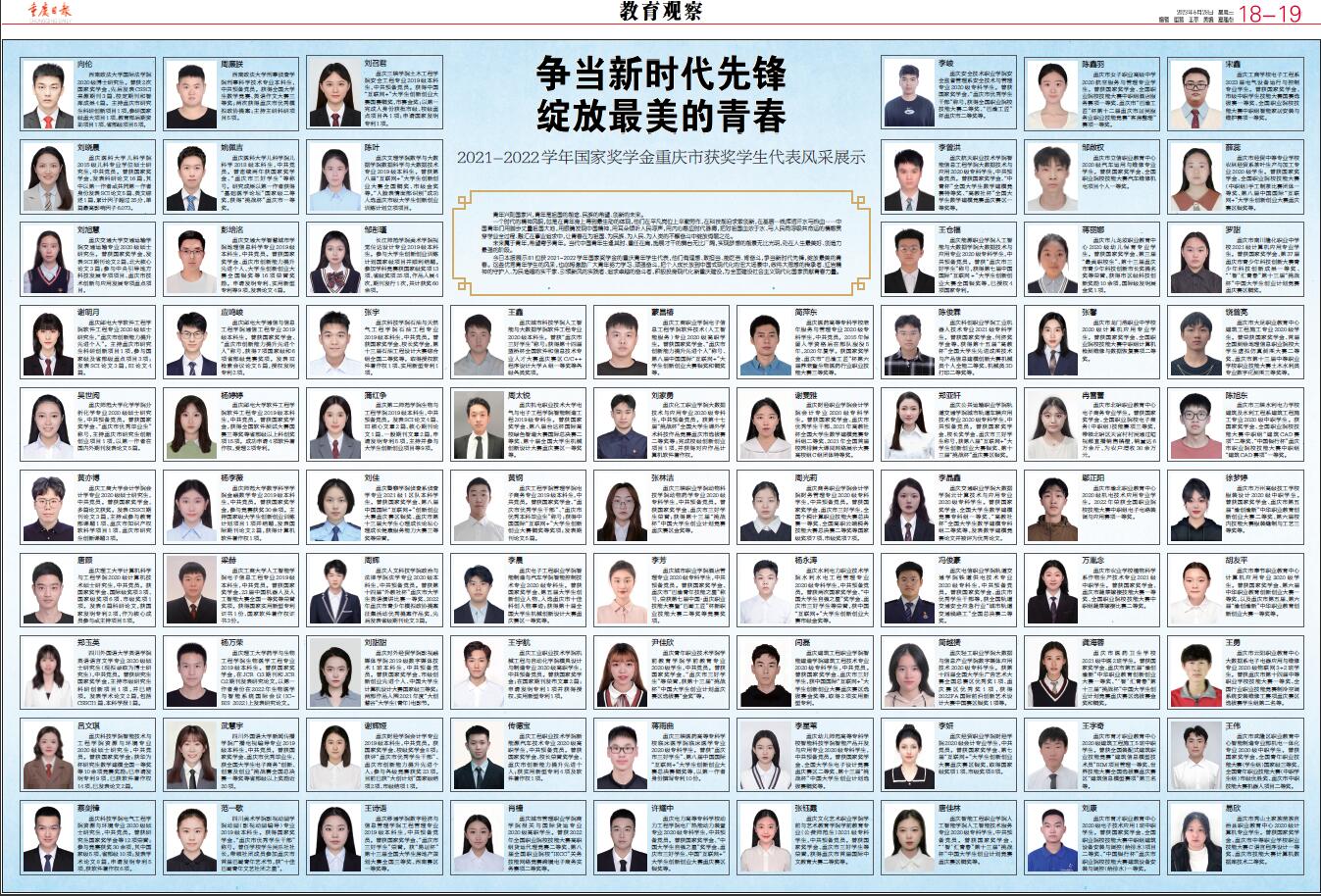 《重庆日报》指出,未来属于青年,希望寄予青年。当代中国青年生逢其时、重任在肩,施展才干的舞台无比广阔,实现梦想的前景无比光明,处在人生最美好、创造力最强的阶段。今日展示的这81位获2021-2022学年国家奖学金的重庆青年学生代表,他们有理想、敢担当、能吃苦、肯奋斗,争当新时代先锋,绽放最美好的青春。这些优秀青年学生的风采,也将激励广大青年努力学习、顽强奋斗,把个人成长放到中国式现代化的宏大场景中,作伟大思想的传承者、红岩精神的守护人、为民造福的实干家、引领新风的实践者、追求卓越的奋斗者,积极投身现代化新重庆建设,为全面建设社会主义现代化国家贡献青春力量。