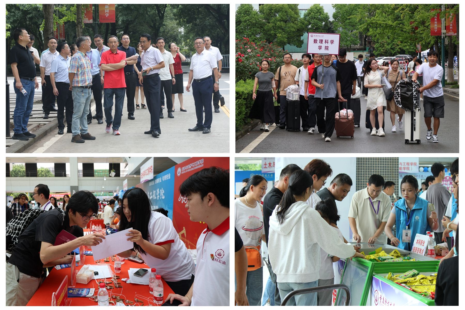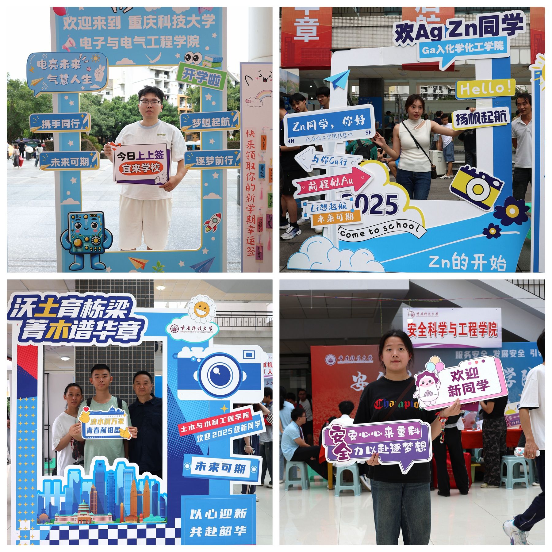 各学院结合学科特色,打造了一场场“沉浸式”迎新活动,让新生在趣味体验中初识专业、融入集体。石油与天然气工程学院以“用石油点亮青春”为主题,打造充满行业特色的石油文化迎新通道,通过实物展示、图文讲解为新生上好“开学第一课”;冶金与动力工程学院设置“我是冶金人”专属打卡点,同步开放宇树机器人展区,酷炫的科技成果展示让新生直观感受学科魅力;材料与新能源学院提前遴选60名优秀志愿者开展专项培训,搭建线上咨询平台,为新生量身定制个性化迎新方案,让服务更精准;机械与智能制造学院通过智能机器人互动演示、机械创新成果展,生动展现“智造”风采,激发新生专业兴趣;电子与电气工程学院准备了承载学科元素的文创礼包、书签领取墙,将温暖与期待传递给每一位新生;化学化工学院以“‘化’遇新知,‘学’启新程”为主题,设计定制化拍照框、签到墙及专属礼包,让专业认知融入迎新细节;土木与水利工程学院以“‘筑’梦启航,‘砼’心相伴”为口号,推出特色打卡板、专业手举牌及印有动漫校园地图的帆布包,让新生在趣味中熟悉校园;安全科学与工程学院设立书记院长咨询点,实时解答新生困惑,同时为生日新生送上定制蛋糕与文创礼物,让关怀直达人心;计算机科学与工程学院(人工智能学院)组建学霸帮扶团、党员先锋团,构建“一对一”朋辈帮扶机制,助力新生快速适应大学生活;管理学院通过爱校教育宣讲、定制纪念礼品、鲜花赠礼等环节,用细腻服务温暖新生;经济与金融学院为新生赠送刻有“算好人生账、守好廉洁心”寄语的黄铜“神算”钥匙扣,将专业精神与价值观引导巧妙结合;数理科学学院准备了印有院徽的帆布包,党员先锋岗志愿者全程提供细致服务,让初心与温暖同行;外国语学院开设“一站式”服务窗口,悬挂多语种欢迎标语,学长学姐现场分享跨文化交流体验,同时赠送院服、院包,增强新生归属感;设计与人文学院将定制礼包与思政教育相融合,把迎新现场变为思政课堂,新生们创作的纪念抗战胜利80周年主题作品,既展现了创意才华,更传递出浓厚的爱国情怀。