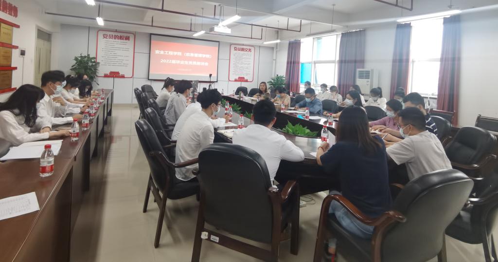 6月1日下午, 安全工程学院(应急管理学院)在笃行楼312会议室召开2022届毕业生党员代表座谈会。学院班子成员、组织员、党支部书记、毕业班辅导员及20名毕业生党员代表参加了本次座谈会。会议由学院组织员王雪主持。