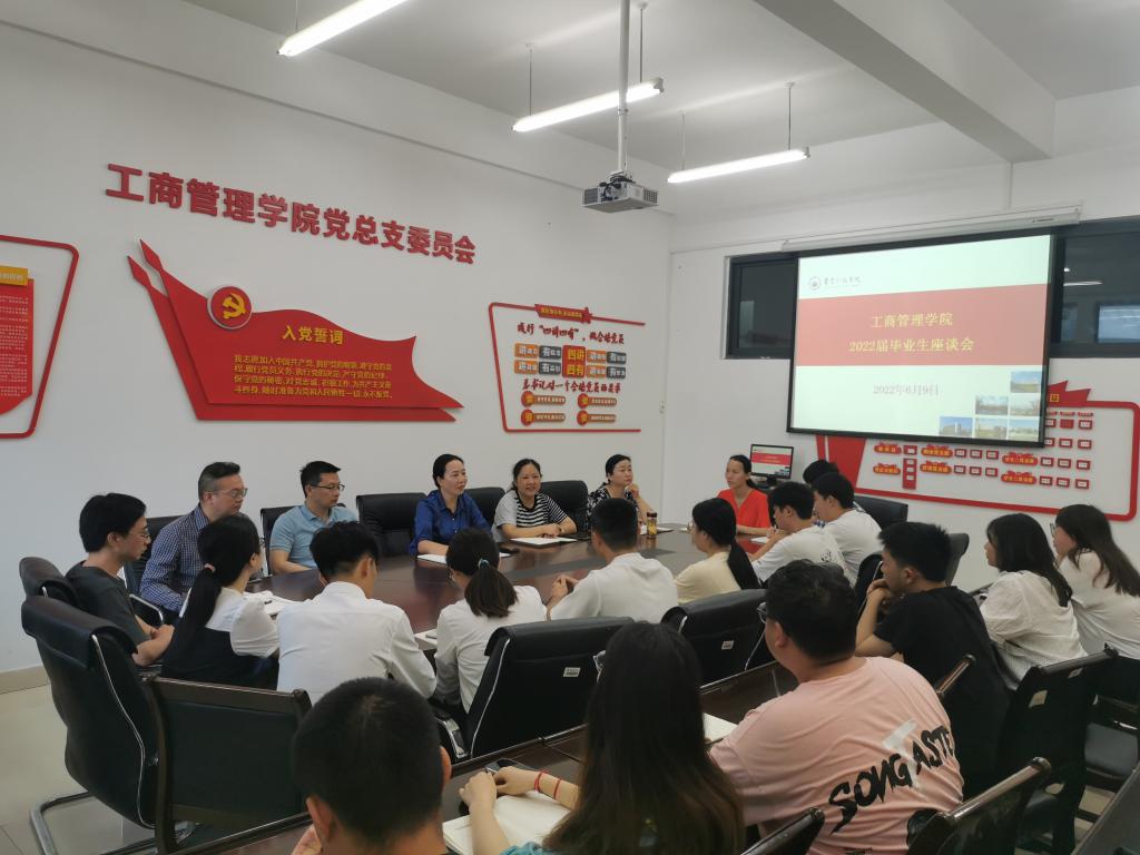 6月9日上午,工商管理学院2022届毕业生代表座谈会在博学楼F310会议室召开。学院班子成员江燕玲、江宇蓉,各办公室、系主任、毕业班辅导员和各专业毕业生代表参加了座谈会。