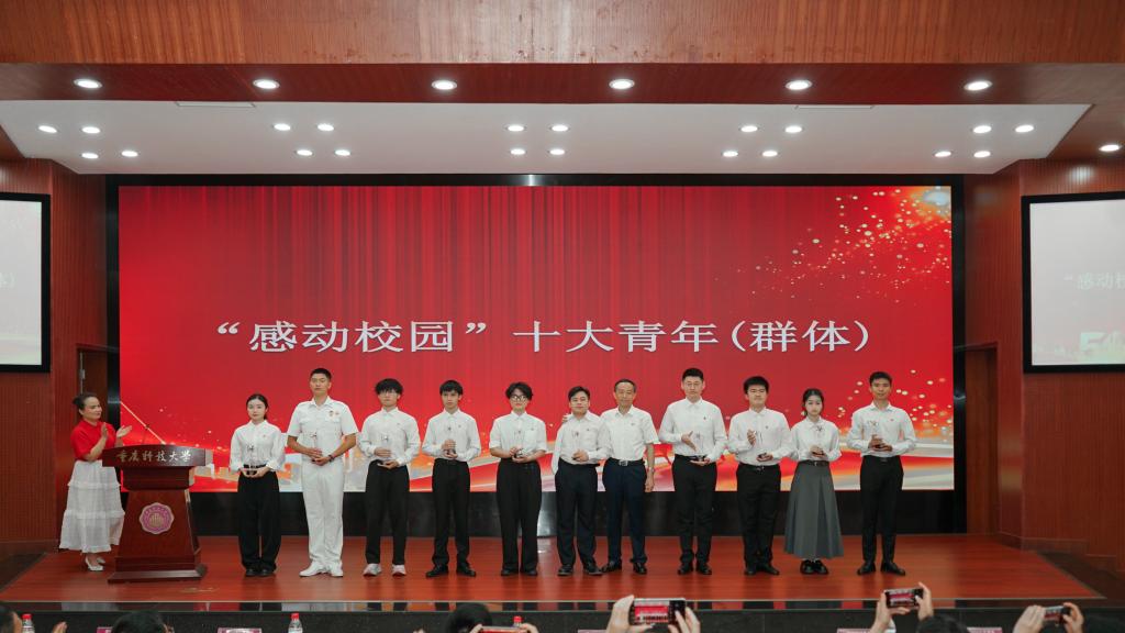 大会在校团委大学生艺术团带来的音诗画《在希望的田野上》《致先辈》《五月的鲜花》《我的祖国》中拉开帷幕。节目融合朗诵、合唱、舞蹈、器乐演奏等多种艺术形式,生动展现了在中国共产党领导下广大青年奋不顾身、投身祖国建设的光辉历程。在《青春之我》的合唱声中,校团委通过视频回顾了近年来团组织团结带领我校青年坚定不移听党话、跟党走的精彩瞬间。随后,“感动校园”十大青年(群体)代表依次上台,用朴实动人的语言讲述青春奋斗故事,激励同学们秉承校训,自信自强、守正创新、不懈奋斗。