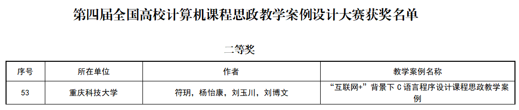 近日,第四届全国高校计算机课程思政教学案例设计大赛由教育部高等学校计算机类专业教学指导委员会指导、桂林电子科技大学承办,聚焦计算机课程思政教学改革,旨在推动课程思政与专业教学的深度融合。经大赛组委会严格评审,我校计算机科学与工程学院(人工智能学院)符玥、杨怡康、刘玉川、刘博文教师团队的《“互联网 +”背景下 C 语言程序设计课程思政教学案例》在本次大赛中荣获二等奖。