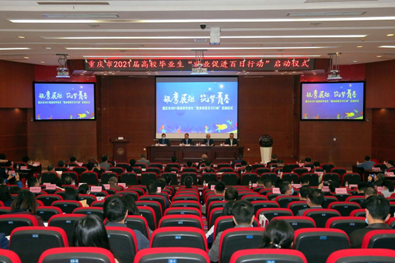 On March 19, the launching ceremony of Employment Promotion 100 Days Action for 2021 college graduates in Chongqing was held in the auditorium of our university. Shuai Xun, member of Chongqing Municipal Education Work Committee and secondary inspector of Chongqing Municipal Education Commission, Xie Xin, member of the party group and deputy director of Chongqing Human Resources and Social Security Bureau attended the meeting. Leaders in charge of colleges and universities in Chongqing, heads of employment departments, school headmaster Yin Huachuan, deputy secretary and vice president Shi Jinliang, heads of Student Works Department, Research Works Department, Party and government leaders of colleges and student affairs also participated in the meeting.