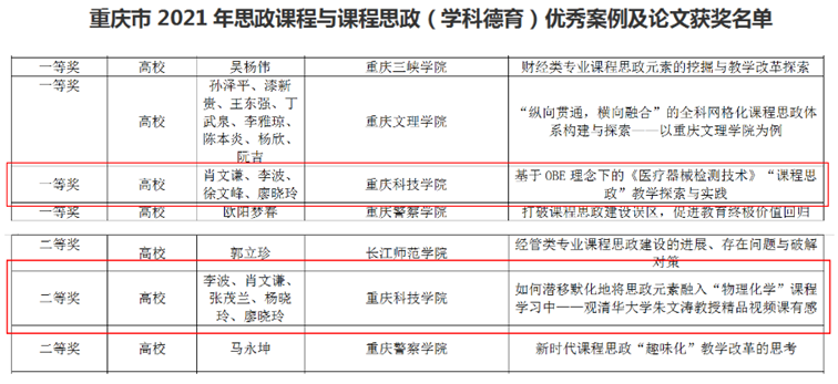 本次重庆市高等教育年会2021年学术年会优秀论文征文比赛,团队成员廖晓玲教授荣获一等奖,徐文峰、李波教授荣获三等奖。重庆市教育科学研究院关于开展思政课程与课程思政(学科德育)优秀案例及论文评选,团队成员肖文谦副教授荣获一等奖、李波教授荣获二等奖。
