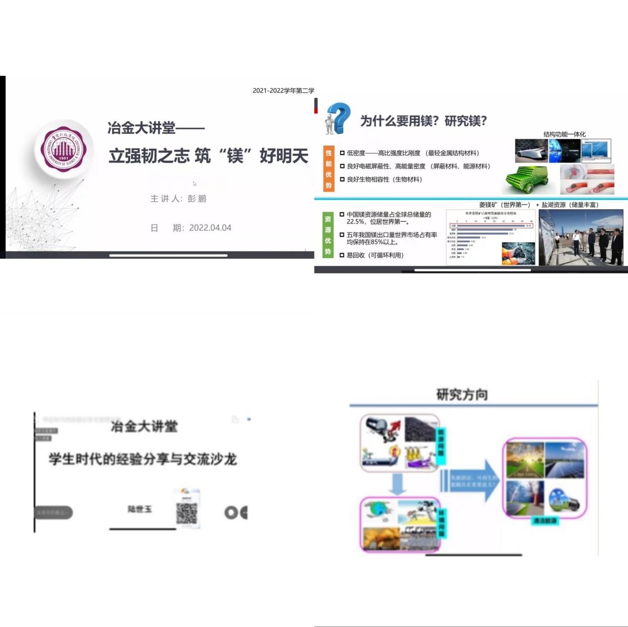 学科建设牵引内涵发展,思想政治融入星空体育平台下载官网。为深入推进学校“三全育人”综合改革,贯彻学校辅导员AB角举措长效化,提高学生对冶金材料类专业的认同感和科研能力,4月4日,冶金与材料工程学院在企业微信大课堂举办了“冶金大讲堂”线上课程第二讲及第三讲,国家级青年人才、冶金与材料工程学院思想政治教育B角教师陆世玉、彭鹏分别主讲题为“学生时代的经验分享与交流”、“立强韧之志,筑‘镁’好明天”的线上课堂,全院2000余名本科生、研究生参加了学习交流。