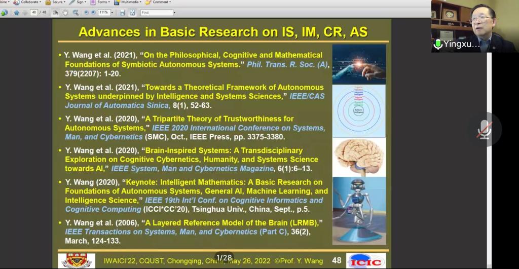 5月26日,加拿大卡尔加里大学终身教授、IEEE Fellow王迎旭应邀于线上为智能技术与工程学院师生做题为“面向通用人工智能和自主系统的智能科学前沿”的专题学术报告,该报告也是2022年人工智能和计算智能进展国际研讨会(IWAI&CI 2022)的主题演讲之一。报告由智能技术与工程学院彭军教授主持,学院陈国荣副院长致辞欢迎,金尚柱、陈宁等教师作为导师代表参会,线上线下共计100余名师生参加了本次报告会。