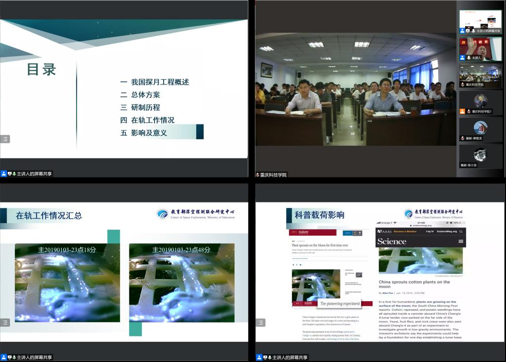 6月13日下午,重庆大学先进技术研究院院长谢更新教授应邀来我校开展题为“月球上的第一片绿叶”的专题学术讲座。机械与动力工程学院部分教师、研究生以及本科生共计110人参加了本次讲座。讲座由机械与动力工程学院院长周传德主持。本次学术讲座由重庆市机械工程学会主办,重庆市机械工程学会学生分会、重庆大学、重庆科技学院、重庆交通大学、重庆邮电大学、重庆理工大学联合承办。讲座还同时开启了线上直播通道,重庆市120余名高校师生同步在线参与。