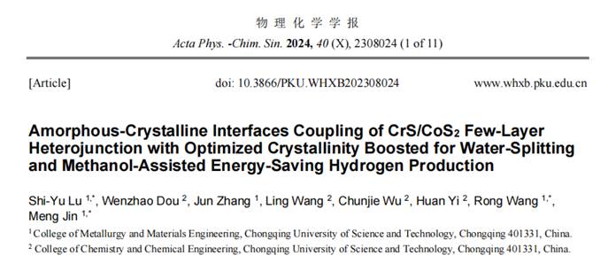 近日,物理化学领域权威知名期刊Acta Phys.-Chim. Sin. (影响因子:10.9,Q1)发表了我校青年教师陆世玉、王融、金梦的研究成果“Amorphous-Crystalline Interfaces Coupling of CrS/CoS2Few-Layer Heterojunction with Optimized Crystallinity Boosted for Water-Splitting and Methanol-Assisted Energy-Saving Hydrogen Production”,重庆科技学院为独立完成单位,陆世玉为第一作者,陆世玉、王融、金梦为共同通讯作者。