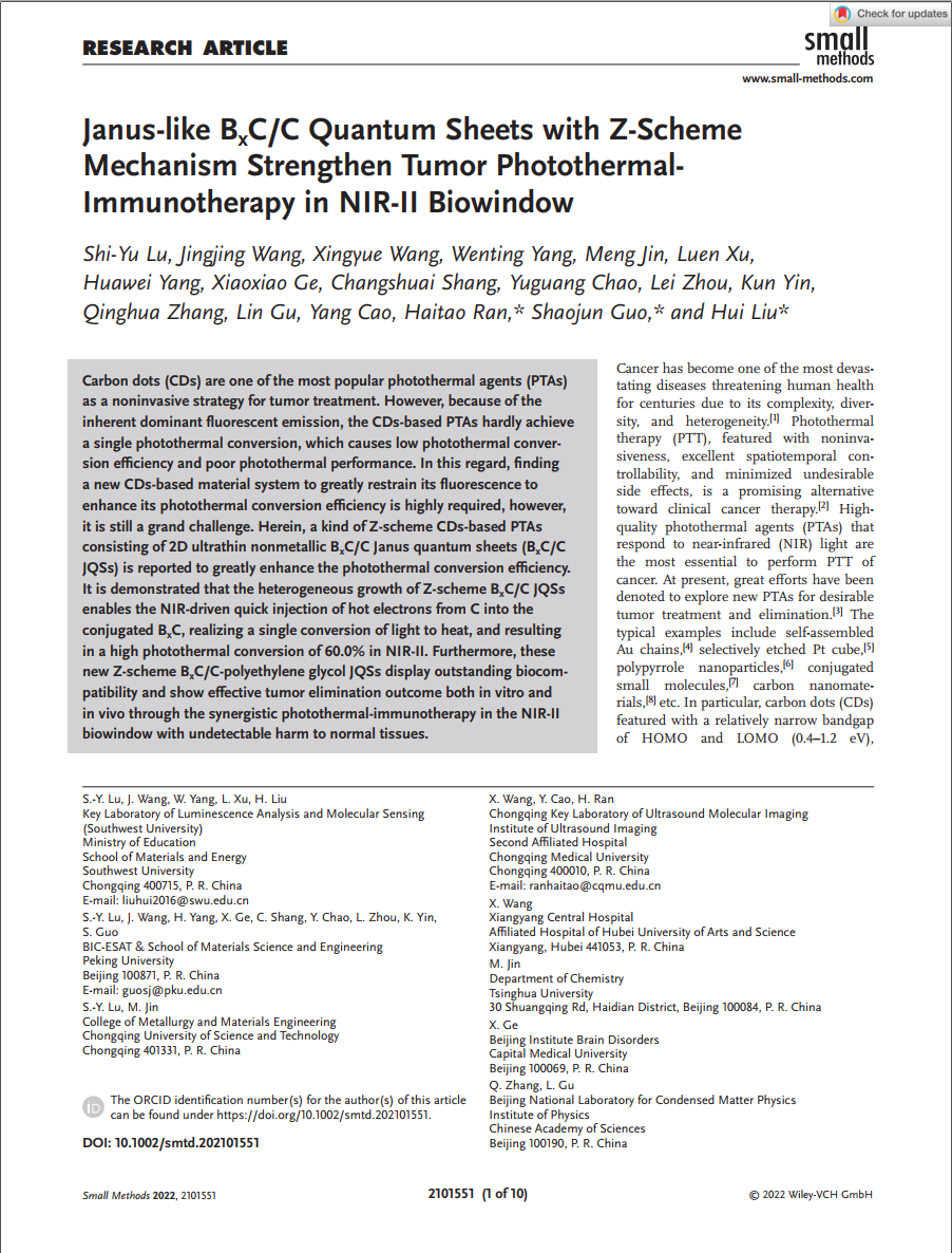 在光热转化材料领域,光热疗法作为一种肿瘤治疗手段,使得光热转化材料的研发成为新的方向,提高光热转换效率变得十分重要。该课题组设计了一类由聚乙二醇修饰的BxC/C二面体超薄量子片(BxC/C JQSs),其独特的Z-Scheme异质结构通过促进电子-空穴分离完全抑制荧光的发射,实现光到热的单一转换,近红外二区的光热转化效率高达60.0%。并且材料具有良好的生物相容性,在后续的体内/体外动物实验中,均达到了良好的肿瘤消融效果。