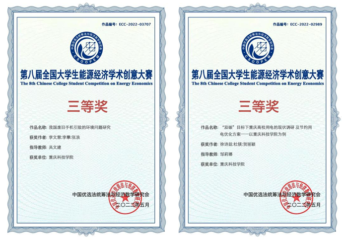 近日,由中国优选法统筹法与经济数学研究会主办的第八届全国大学生能源经济学术创意大赛结束。我校法政与经贸学院2020级资源与环境经济学专业学生丁前敏团队作品《电动车动力电池回收利用研究——以重庆大学城为例》获全国本科组二等奖;徐诗益团队作品《“双碳”目标下重庆高校用电的现状调研及节约用电优化方案——以重庆科技学院为例》、李文慧团队作品《我国废旧手机引致的环境问题研究》分别获得全国本科组三等奖;程诺团队作品《双碳目标下大学校园低碳行为方式路径研究》获得区域赛三等奖。