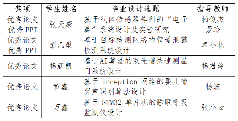 首届全国仪器类专业本科生毕业设计交流会,于2022年5月15日线上召开。5月23日,大会程序委员会通过会议表决,评选出了152篇优秀毕业设计(论文)和优秀PPT,我校测控技术与仪器专业选送的5篇全部评选为优秀毕业设计(论文)(作者分别是2022届毕业生张天豪、彭乙琪、杨新凯、黄鑫和万鑫5位同学)。其中,张天豪和彭乙琪的答辩PPT被评选为优秀PPT。