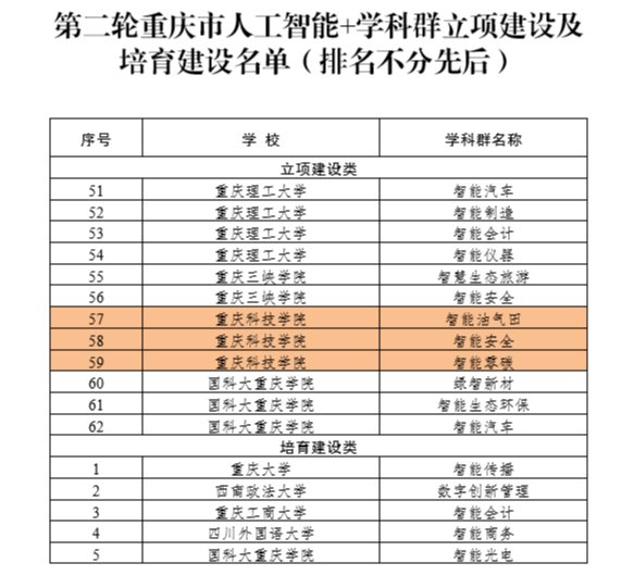 近日,重庆市教育委员会下发《关于公布第二轮重庆市人工智能+学科群立项建设及培育建设名单的通知》(渝教研函〔2022〕10号),我校智能油气田、智能安全、智能零碳3个学科群获批为第二轮重庆市人工智能+学科群建设项目,比第一轮增加智能零碳学科群。