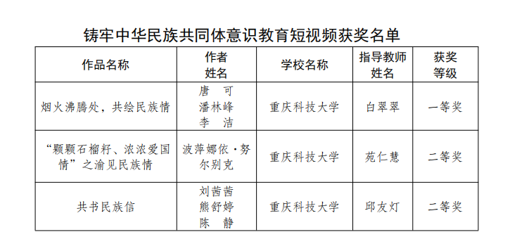 近日,重庆市教育委员会、中共重庆市委统战部、重庆市民族宗教事务委员会公布了《铸牢中华民族共同体意识教育学生作品征集活动获奖情况的通报》(渝教基函〔2025〕46号)。我校选送3部作品获一等奖1项、二等奖2项。