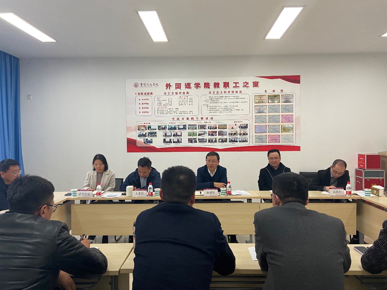 3月29日下午,校长赵明阶深入外国语学院调研指导工作。党政办公室、人事处、教务处、研究生处等部门负责人陪同调研。外国语学院班子成员、组织员及各三级机构负责人参加座谈。