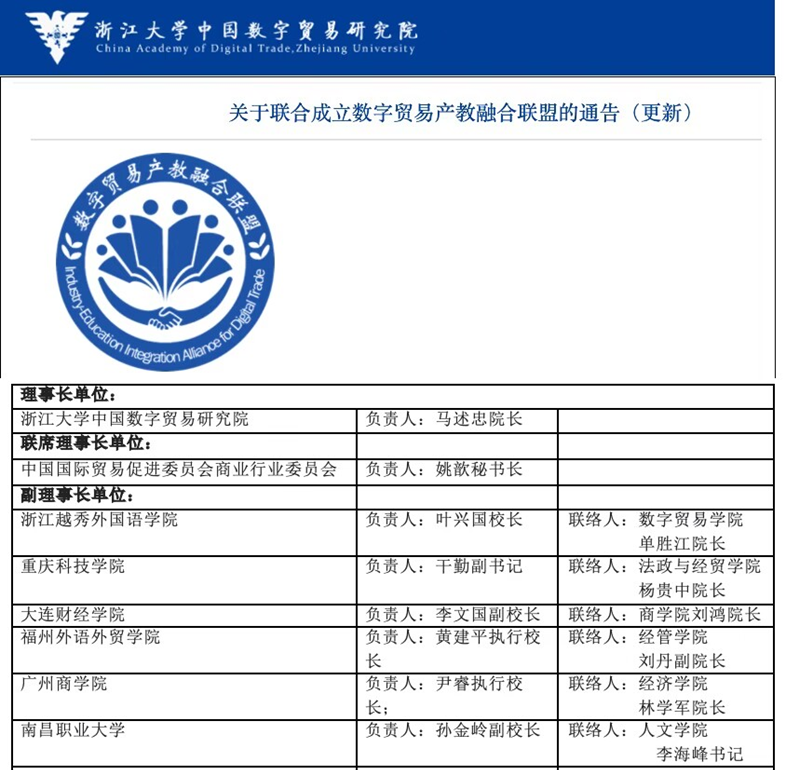 数字贸易产教联盟今年年初由浙江大学中国数字贸易研究院和浙江大学数字丝绸之路协同创新中心联合中国国际贸易促进委员会商业行业委员会共同发起,目前已吸纳全国近百所应用型本科高校和高等职业院校成为成员。我校法政与经贸学院负责具体参与联盟各项工作及活动。通过联盟的平台优势,我校能够在国际经济与贸易国家级一流专业建设点和国际商务专业硕士点建设工作上更好利用全国优势资源,提升数字贸易人才培养质量,扩大社会服务成效,有效衔接教育链、人才链、产业链和创新链,推进校企深度融合。