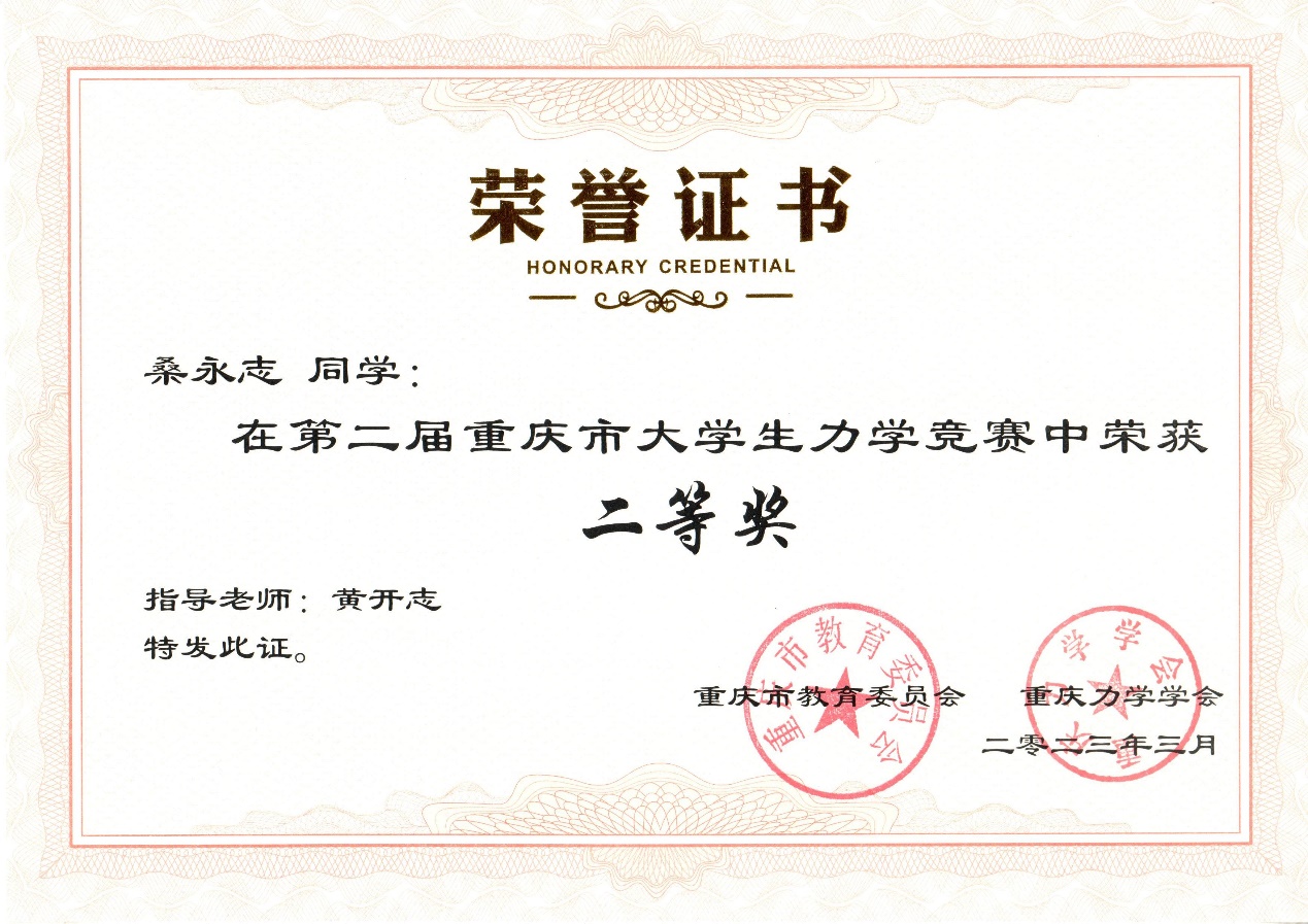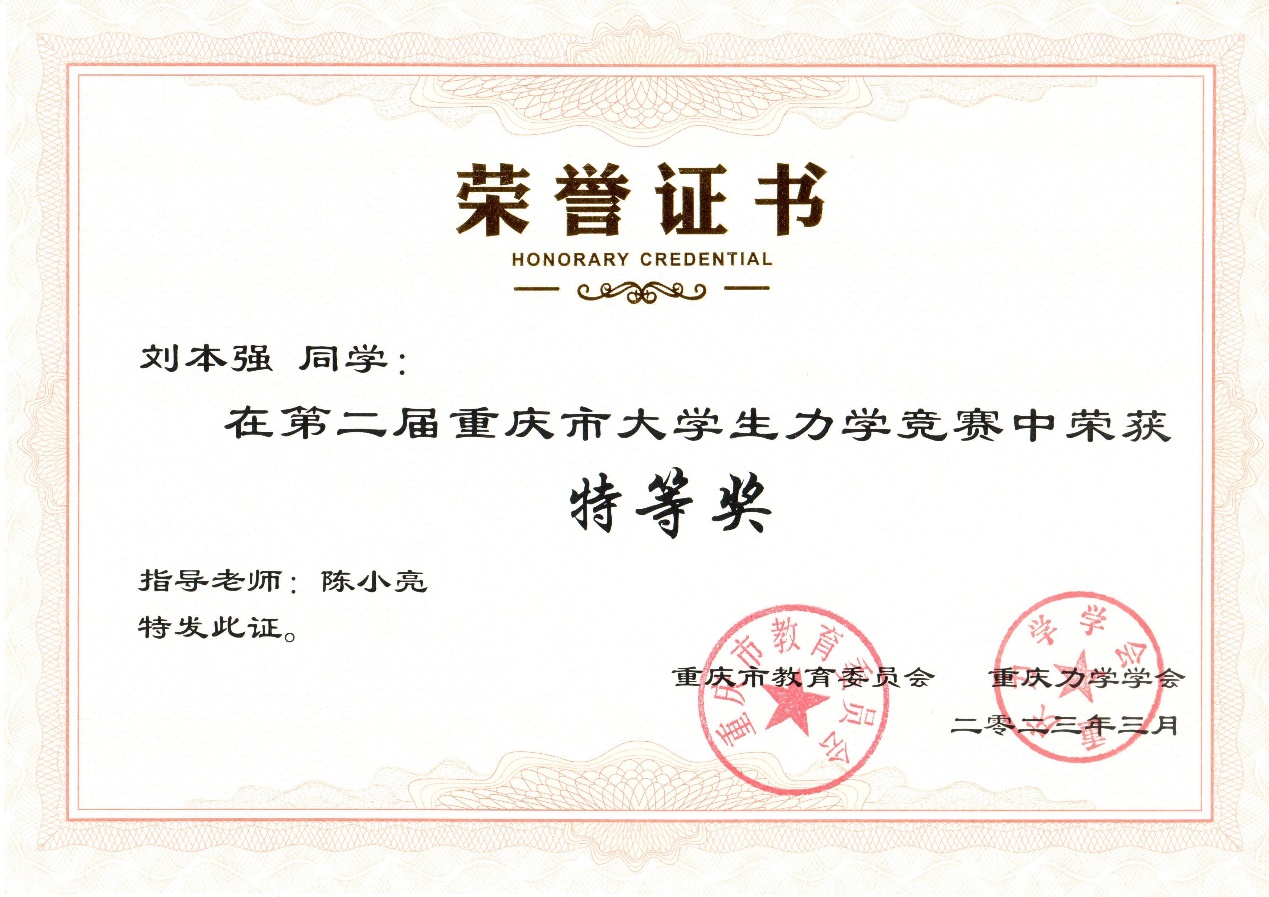 近日,第二届重庆市大学生力学竞赛成绩揭晓,我校组织学生参赛并获佳绩。由建筑工程学院陈小亮副教授指导的理论与应用力学专业2019级学生刘本强、2021级学生陈豪获得2项特等奖,同时获得二等奖1项、三等奖4项、优秀奖7项。