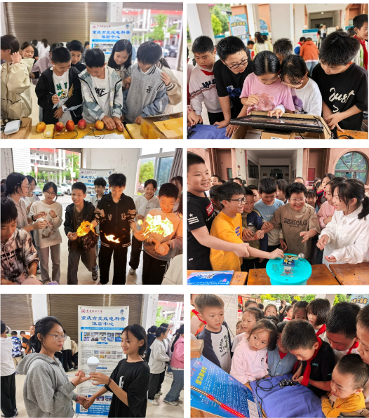 在黔江区育才中学、舟白中学,“火焰掌”实验引爆全场,当科普老师将混有可燃气体的泡沫轻敷在学生掌心,火焰在指尖跳跃时,引起了阵阵欢呼声;“水果钢琴”排起了蜿蜒长队,学生们都兴致勃勃地等待体验水果带来的悦耳琴声,直观解锁导体与电路的奥秘;“闪电画”更成为焦点,学生们屏息凝视着“闪电”在画板上勾勒出树木轮廓。在石柱县西沱中学、砫蒲小学,学生们在老师的指导下操作发报机,用摩尔斯电码传递信息,沉浸式感受通信技术的百年变迁;在“醉酒体验”环节里,戴上特制眼镜,脚步踉跄、笑声不断,在轻松氛围中感悟醉酒驾驶的危险;“千人震”热闹非凡,学生手拉手连成“人体电路”,在开关接通的瞬间,体验着电流的感应;“数字人项目”更是吸粉无数,现场拍摄照片即可变身虚拟“科普小达人”,让科技互动充满新鲜感。