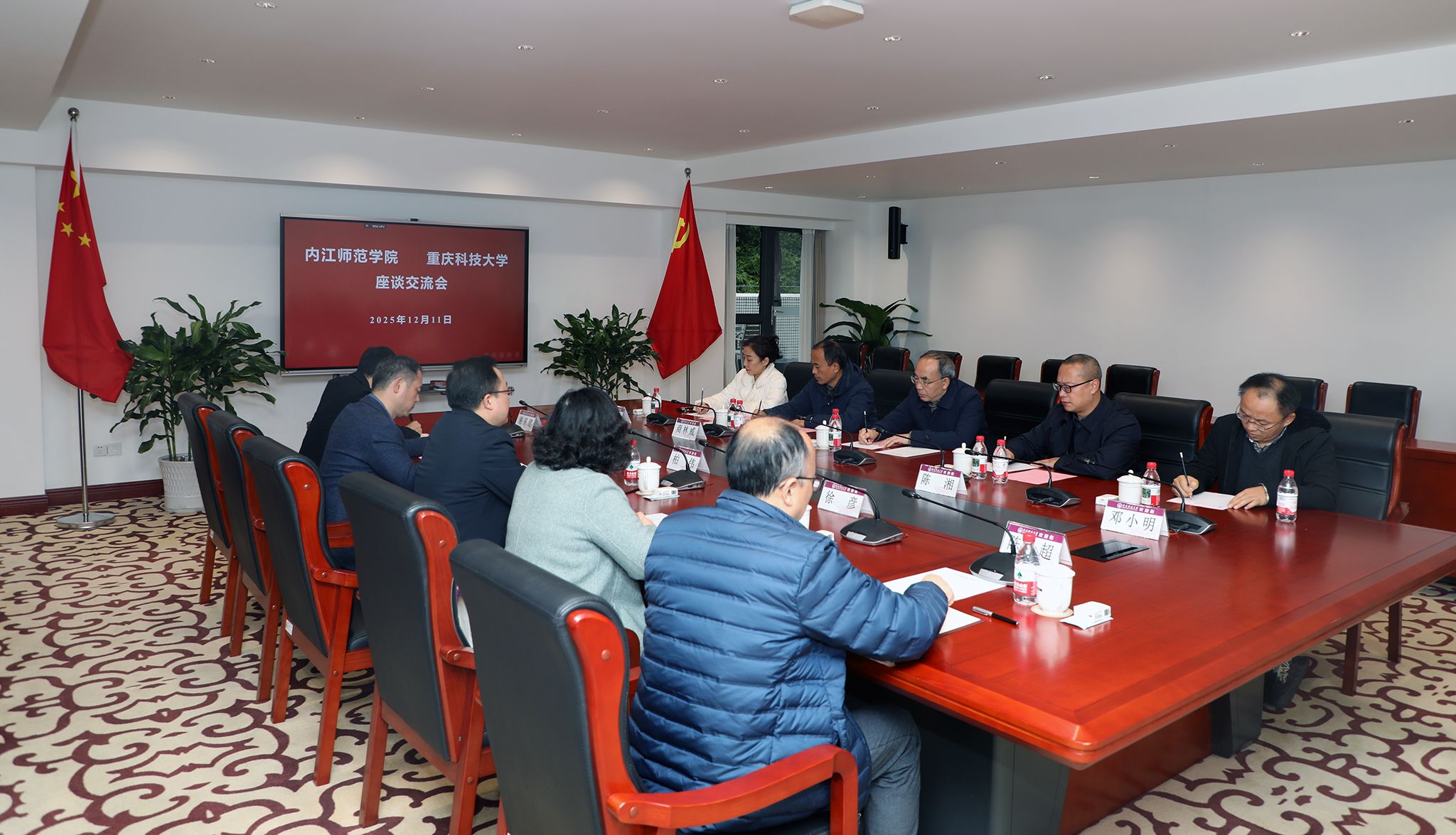 交流座谈会在办公楼206会议室召开。我校副校长柏伟对黄辉一行来访表示热烈欢迎,系统介绍了我校基本情况,并重点分享了在办学治校、学科建设和科学研究方面的实践经验与成效。黄辉对我校的热情接待表示感谢,并介绍了内江师范学院的发展概况。他表示,希望两校在协同创新、学科建设经验互鉴、科研成果转化联动等方面进一步加强合作,携手推动双方高质量发展。