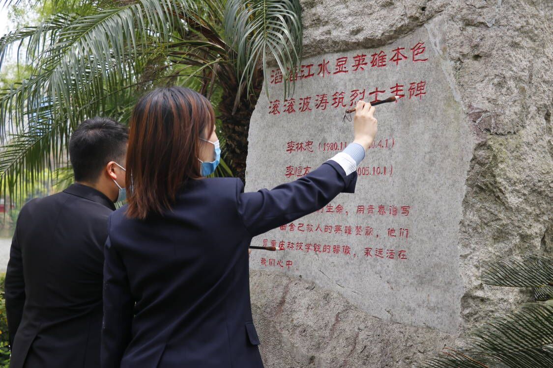为英雄纪念石碑描红。4月2日中午,“缅怀先烈 传承精神”清明缅怀英烈活动在灵秀湖畔英雄纪念石碑前举行。学校教师代表、林忠班学生代表参加了本次活动。在英雄纪念石碑前,师生们重温了李林忠、李恒太的英勇事迹,学习他们不顾个人安危、舍己救人的精神。师生们神情庄重肃穆,向英烈们默哀、献上鲜花。师生们拿起小毛笔,庄严地为英雄纪念石碑描红,他们一笔一画用心描红、用情刻写。
