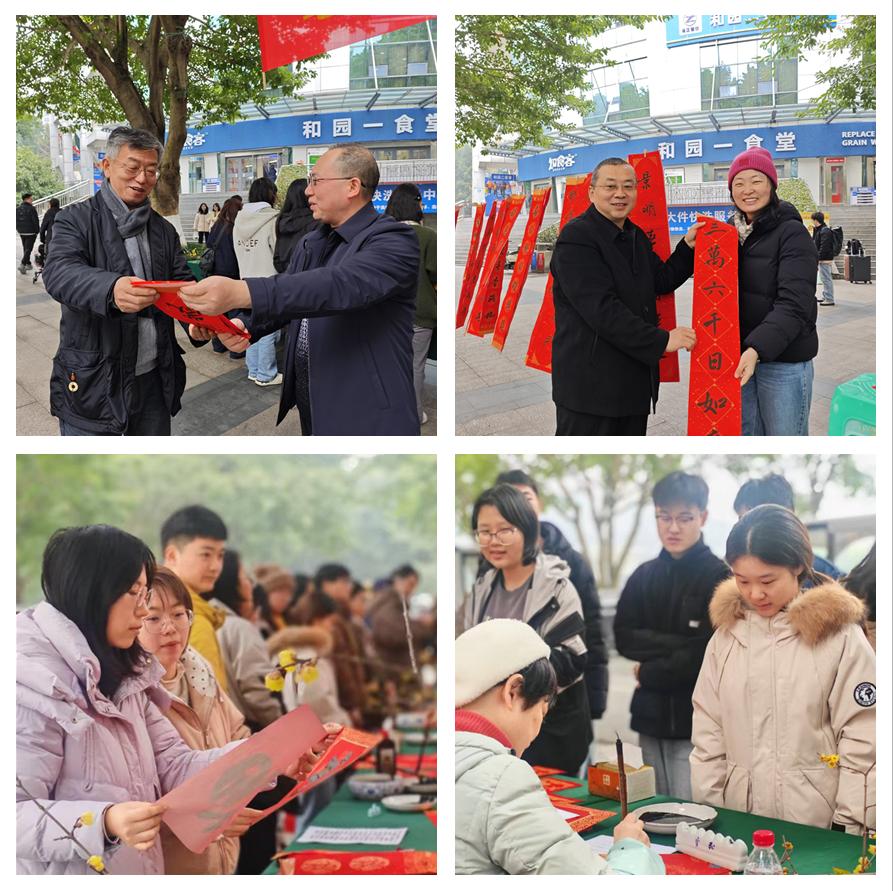 活动现场,书画协会的老师们大展身手,挥毫泼墨,将美好的祝愿凝聚于一幅幅春联之中。红纸黑字,笔走龙蛇,每一笔都蕴含着对新年的美好祈愿和对师生们的深深祝福。喜庆的氛围,浓浓的年味吸引了众多师生的驻足,大家或观赏书画协会老师们的精湛技艺,或亲自上阵体验书写的乐趣,更有不少老师和同学们兴奋地书写着自己心仪的春联,准备带回家中,为家人带去学校的新春祝福。