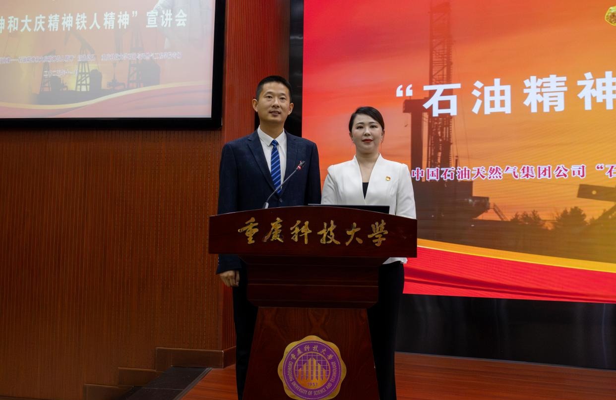 宣讲中,郑媛元、王秀峰两位同志以大量珍贵的历史照片、音频资料、影视资料和经典故事,深情讲述了在党的领导下那场艰苦卓绝、波澜壮阔的石油大会战,生动再现了以铁人王进喜为代表的老一辈石油人战天斗地的感人事迹,系统阐释了以爱国为核心、以创业为主题、以求实为根基、以奉献为本质的石油精神、大庆精神和铁人精神的丰富内涵。师生们全神贯注聆听这段跨越时空的精神对话,切身感受石油先辈们在极端困难条件下为国分忧、为油拼搏的豪迈气概,深刻理解这一精神财富作为中华民族脊梁的时代价值。