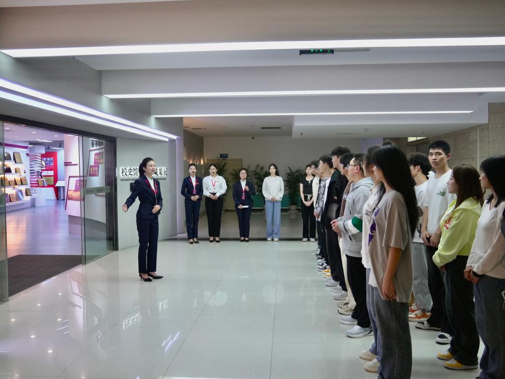 新生代表们的行程首站为图书馆,其间,陈祖琴、李荣菊老师就图书馆的场馆构造、楼层分区、书籍检索与借用以及其他常用功能进行了详细的介绍,并热情邀请同学们参与图书馆举办的各类文化教育讲座。校史馆内,在讲解员的讲解下,同学们了解了学校的成长历程及建校70余载的光辉成就。